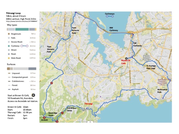 The ride starts at Ambury Farm, near the information centre. From their we take the Watercare Coastal Walkway down to and around the Mangere Lagoon. This section is light gravel. We then return to the information centre before heading towards the Manukau Yacht & Motor Boat Club via the Kiwi Esplanade Walkway which we follow all the way to the Nga Hau Mangere Bridge. We go over the bridge, turning left on the Onehunga side and riding up to the Taumanu Reserve where there are toilets. We then go back over the bridge to the Mangere Bridge town centre where there are numerous eating establishments for refreshments and/or lunch. We then retrace our path up Kiwi Esplanade back to Ambury Farm.